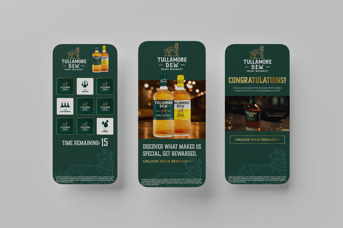 Led creative strategy, concept development, and creative direction for Tullamore D.E.W.’s interactive mobile reward game, translating brand heritage into a premium, performance-driven experience. Directed the end-to-end creative — from gameplay concept and UX flow through visual system and final execution — designing an engaging journey that combined brand storytelling with lead capture and reward mechanics to drive consumer participation and conversion across mobile touchpoints.